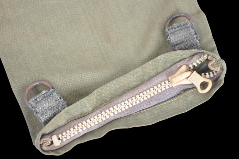 A single green canvas Fallschirmjager stick grenade bag with off white Ri-Ri zipper & two D ring adaption to one side for carrying sling made from the blue webbing central joining strap.