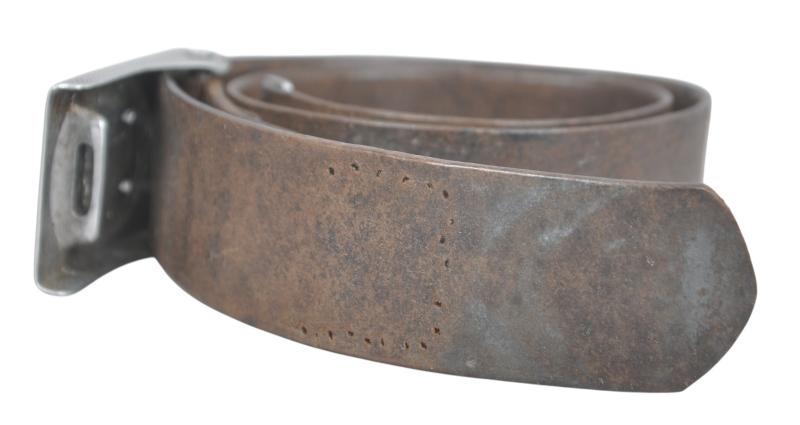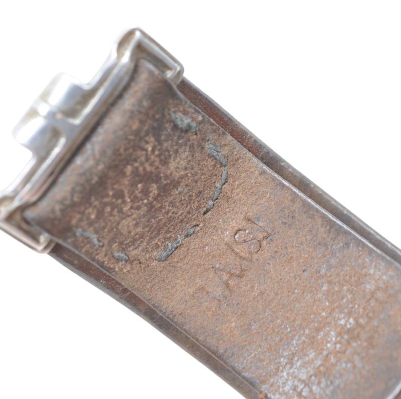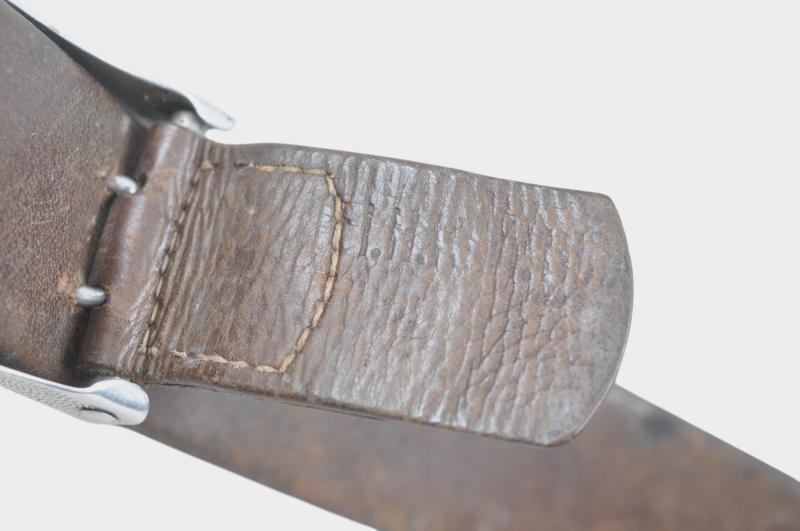 Early Luftwaffe issue chocolate brown belt & second pattern aluminium buckle. Luftwaffe 'Fl.H' (Flieger Horst) markings to buckle tab & LBA ( Luftwaffe Bekleidungsamt) marking to belt leather with matching aluminium tab.