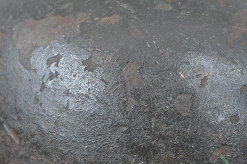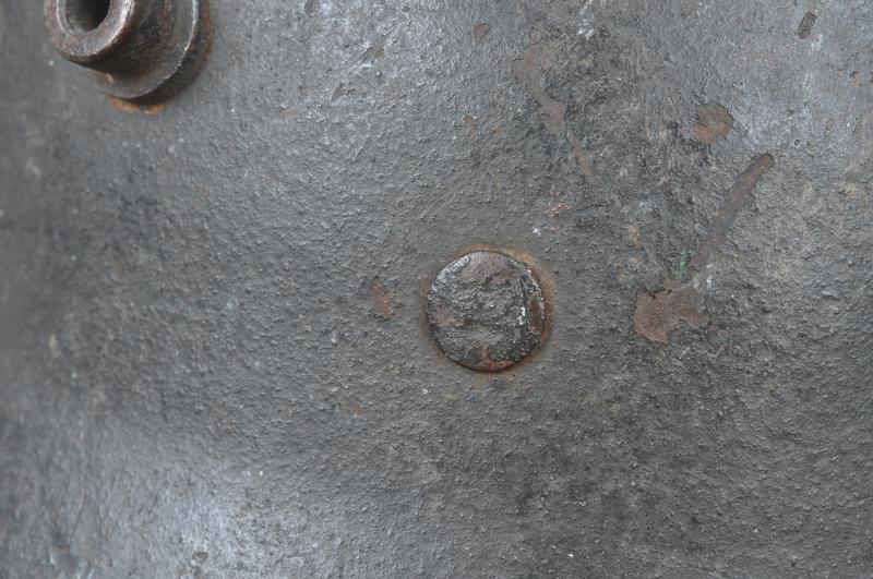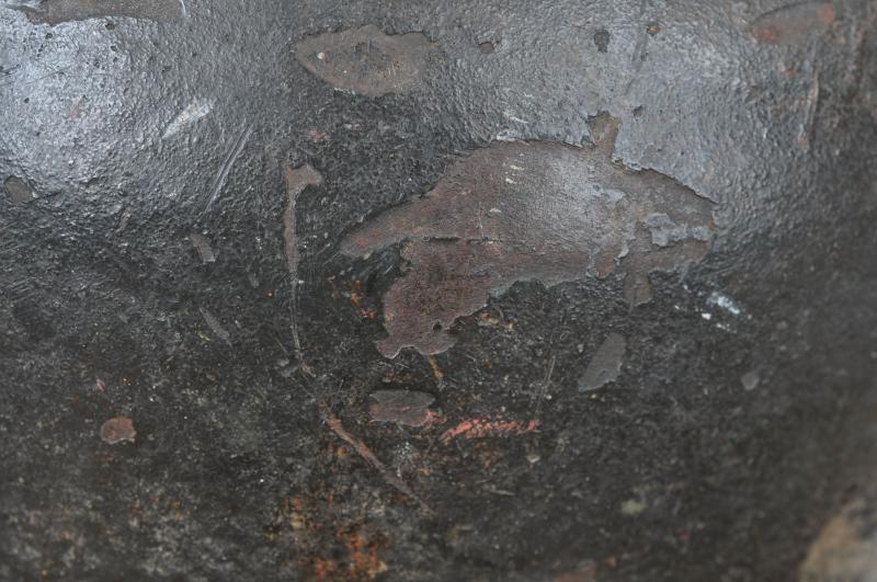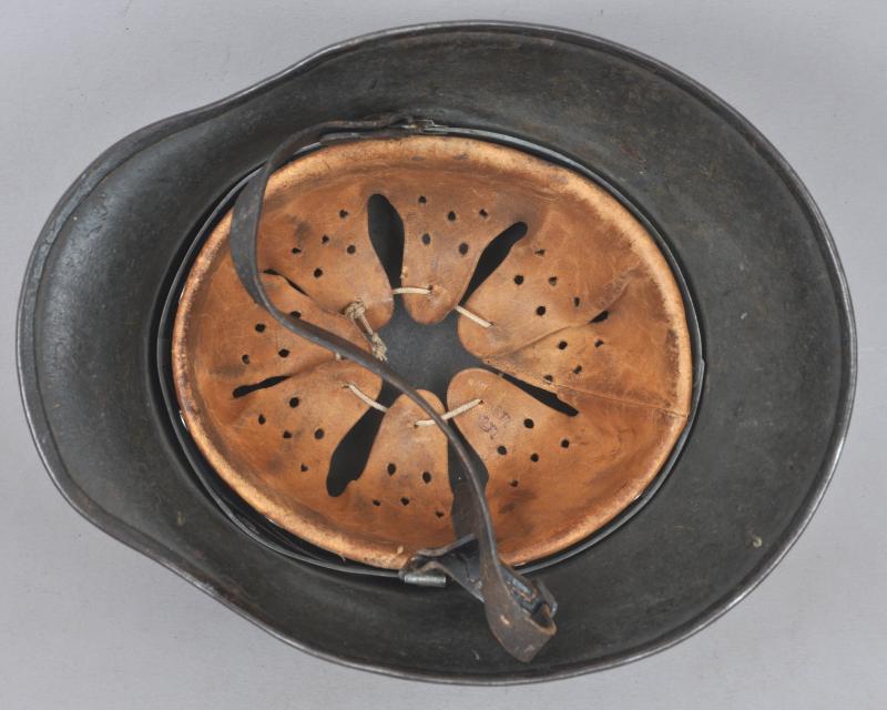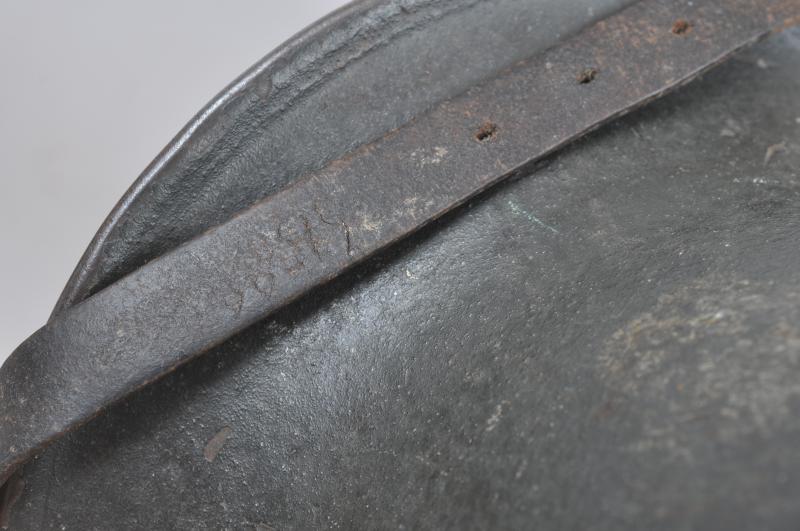 Made by 'ET' with an apparent size of '64' it is interesting to note that the army decal is of a type well recorded as being seen on transitional helmets an example of this being found on page 334 of the superb reference book Germanys Combat Helmets by Ken Niewiarowicz . All three liner pins have paint matching the rest of the shell & are totally undisturbed with zinc liner band dated 1942. Leather liner baring size stamp 55. Comes with original chinstrap this having soldiers number faintly scratched into it.