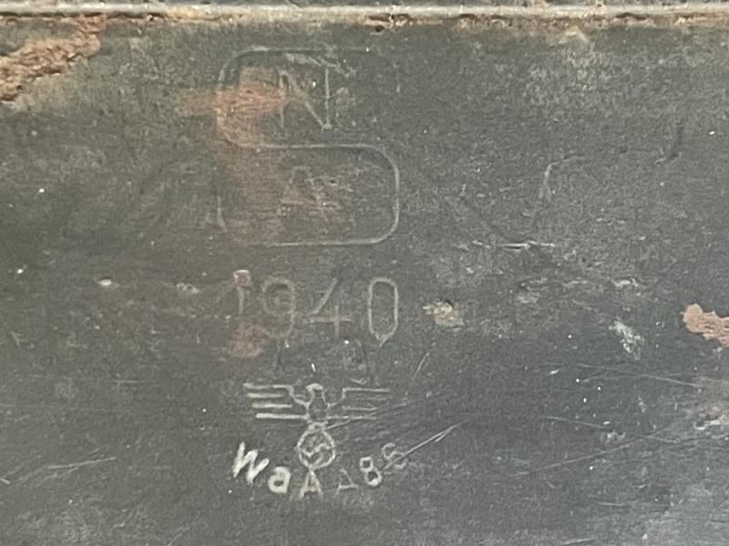 A completely untouched 1940 dated Machine Gun ammunition tin for vehicles. Roughly hand painted over the factory grey green in a tan mid to late war "Dunkelgelb" RAL paint . This likely indicates this was the outer face of the tin while held within a vehicle mounted racking system . Eagle & swastika marked with 1940 date .