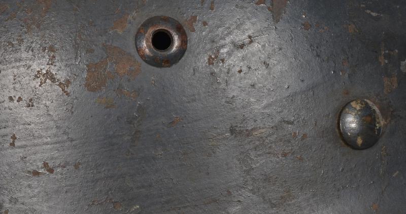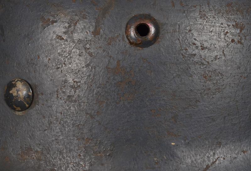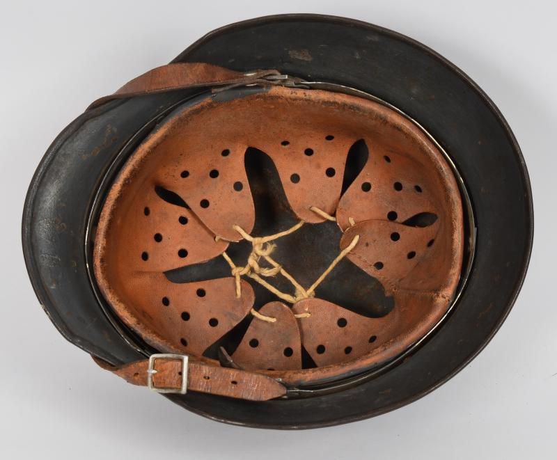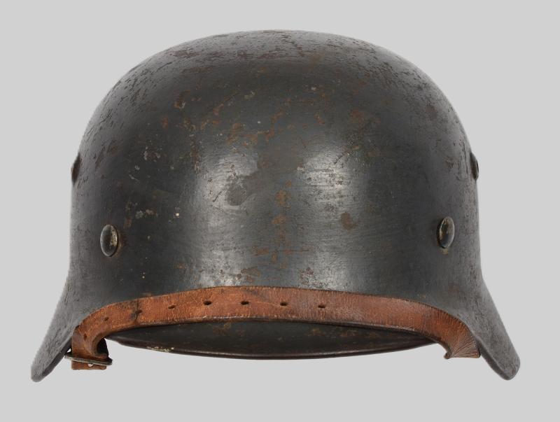The exterior and interior have had a secondary mid blue grey overpaint hand brush applied , this likely indicating a unit level refurb . The simple overpainting would probably further indicate mid to later war work . The liner was clearly left in place while this refinishing took place ,as there are tell tail areas of overpaint upon the liner leather and chinstrap .We estimate this shell to be a 64 but maker and lot number are now obscured by the paint layering . The liner is good and tight with supple leather . The original chinstrap is mounted reversed with the brown face out , this being a typical early Luftwaffe detail .This helmet is in very nice untouched condition and thus makes a good representative example of a true long serving luftwaffe ground troops combat helmet.