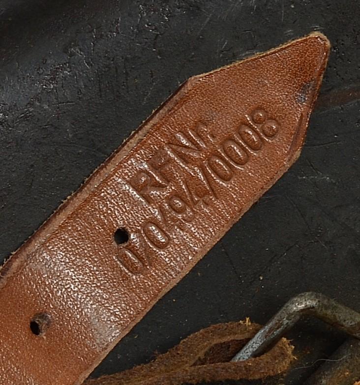 Liner good with original supple chinstrap having excellent RF "Reichs fabrik" numbering stamp to end . Textbook late war soldiers helmet .
