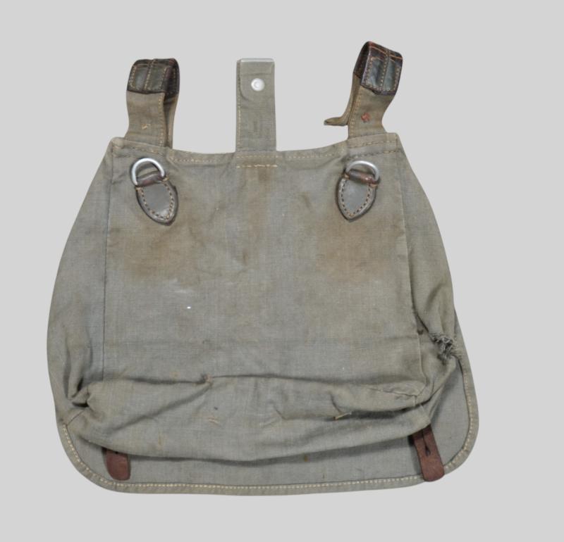 An early Kriegsmarine bread bag in excellent light field used condition . To the inner there is a faint KM T shaped boxed like acceptance / issue depot stamp . The canvas is good and strong with only a gentle fade. All leatherwork good in a dark green chrome tanned leather .