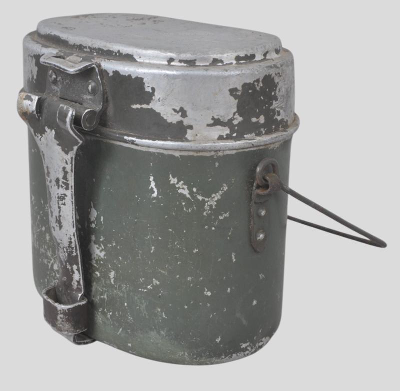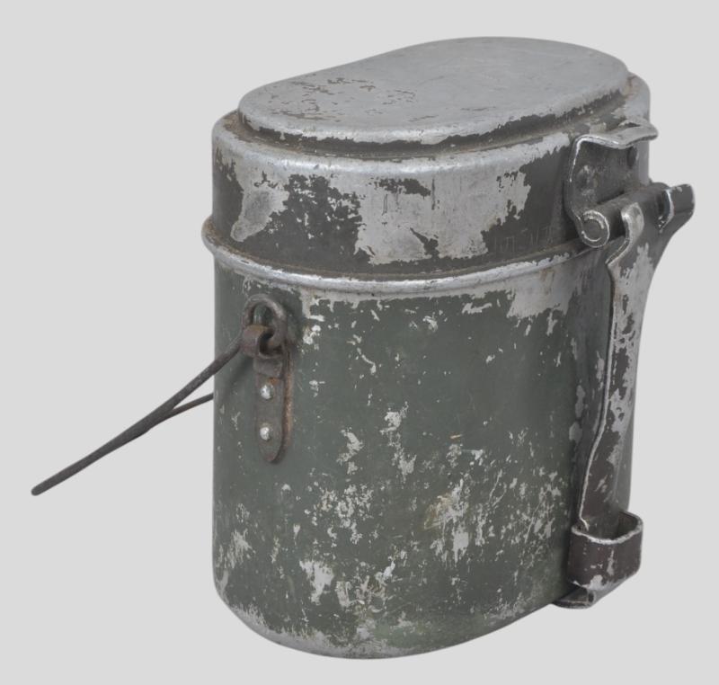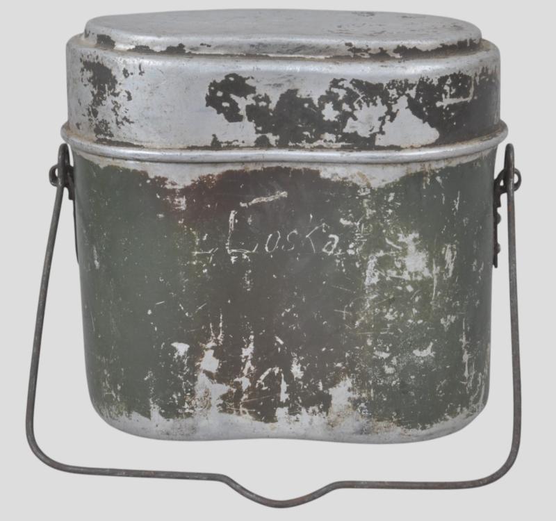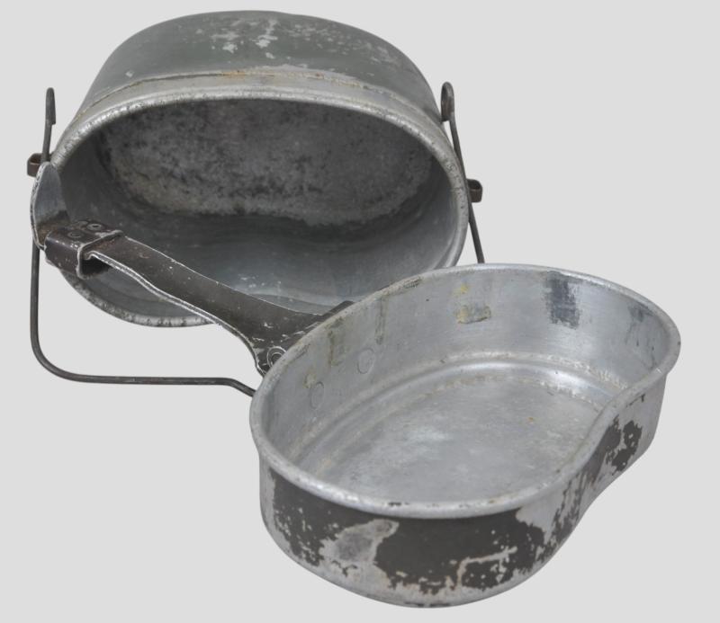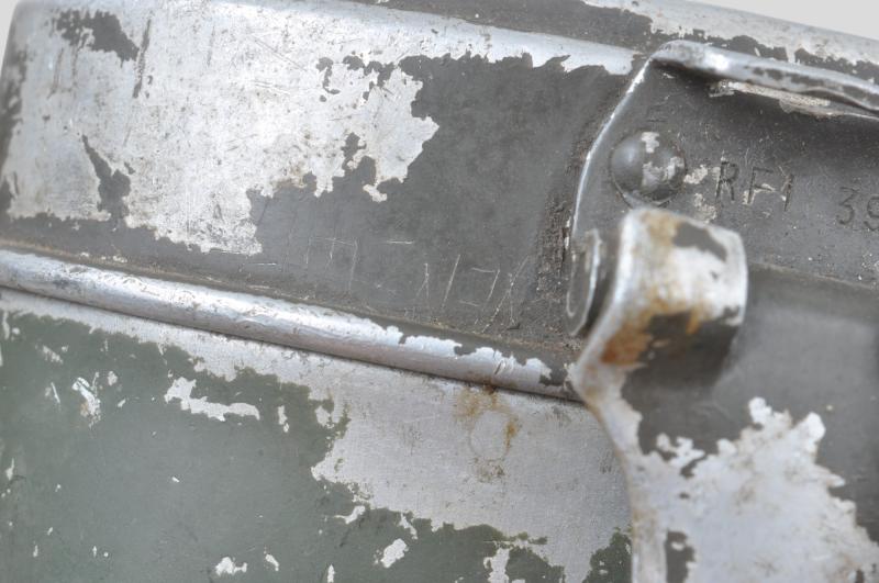 Early aluminium messtin marked 'RFI39' to lid with soldiers names to tin & a hand scratched unit vehicle marking to lid.
