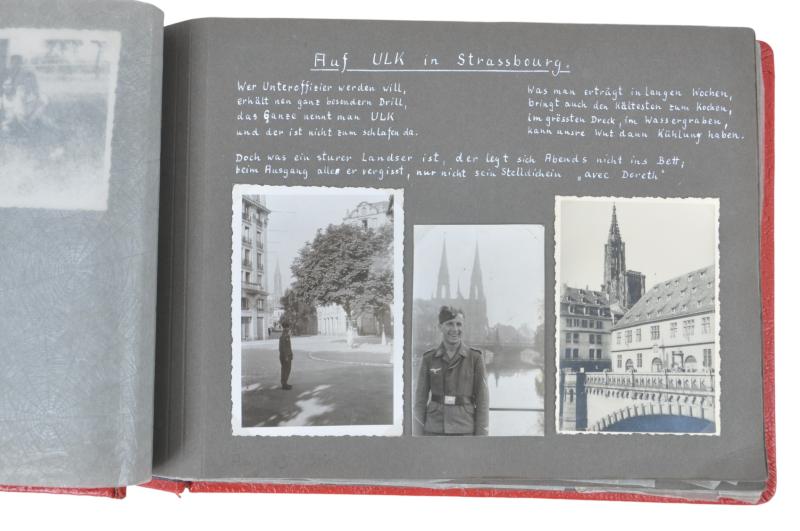 Various shots of ground crew training with weapons , helmets etc also leave photos in Strasbourg & various other places. Later photos of aircraft & him sat in what appears to be a Focke Wulf 190. Various hand drawn aircraft & related awards to some pages.