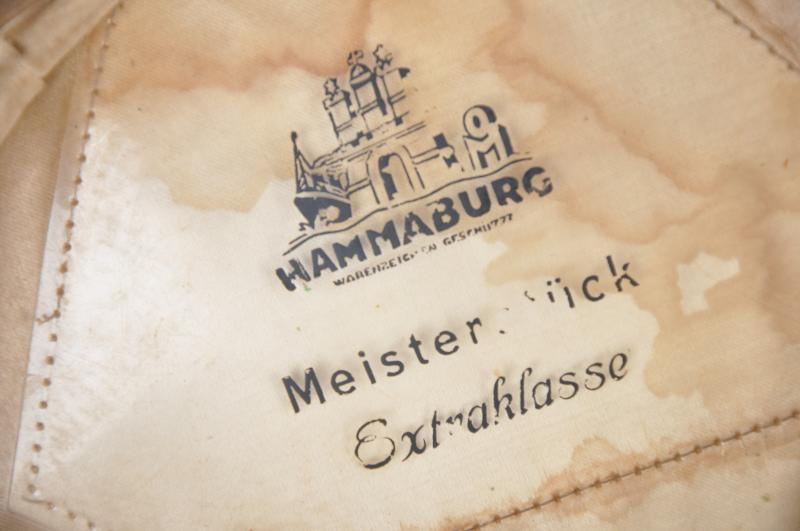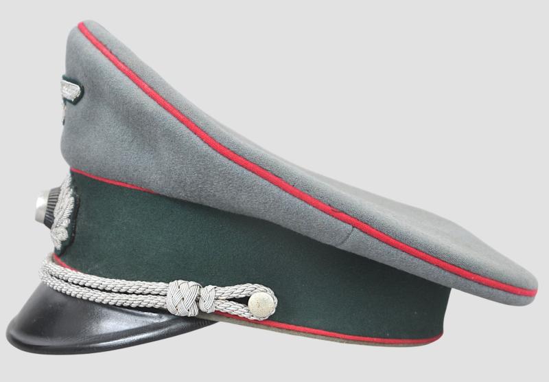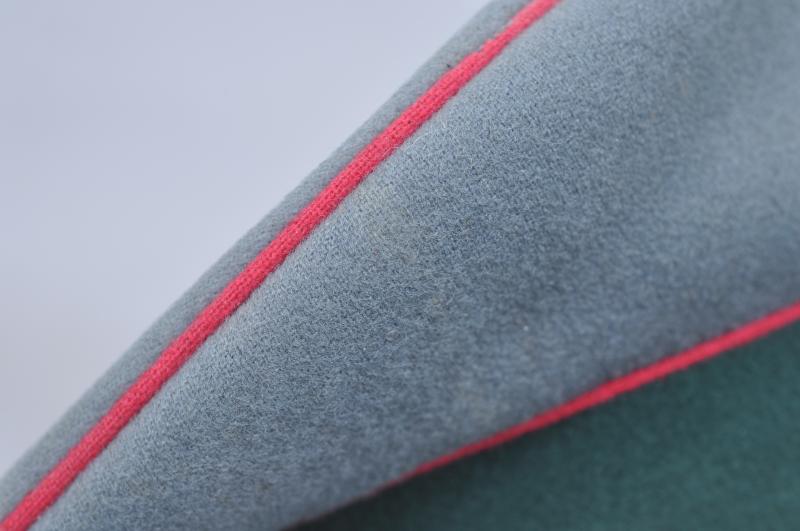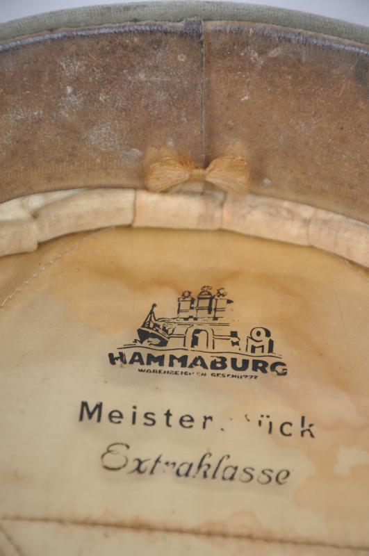 The carmine piped Staff Officers cap is distinctively different from the red waffenfarbe of artillery when placed side by side. Constructed from fine quality doeskin wool it has silver bullion eagle & cockade , both originally stitched to the cap . Interior has celluloid diamond with maker name 'Hammaburg' & 'Meisterstuck Extraklasse' referring to its expensive high quality specification as provided by the tailor who made it to 'Extraklasse' standards. The champagne lining matches the underside of the cross hatched peak with perforations to forehead area of the sweatband intended to aid in ventilation when worn. To the underside of the peak can be seen the thumb print of the wearer from repeated wear of the cap.