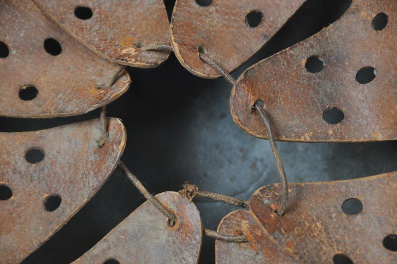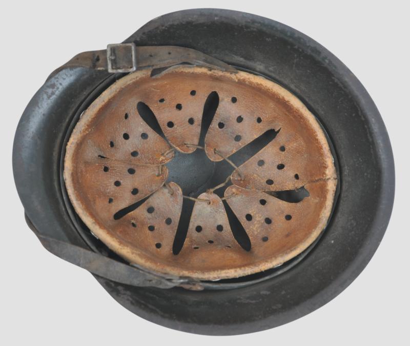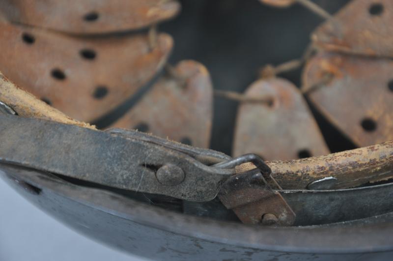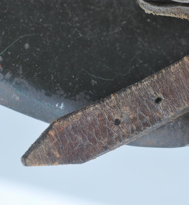 Underside of shell has faint markings to rear of skirt these apparently a faint 'CKL' mark ( ET) & size 64. Lot number '3035' . Liner retains its original tightening cord . Leather chinstrap has never been off of the helmet this having grey painted steel buckle & faintly marked pointed end.