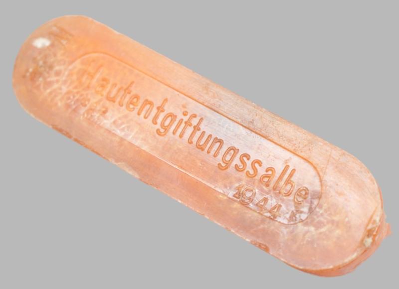 Skin decontamination container as carried as part of the soldiers personal anti gas kit. Dated 1944 .