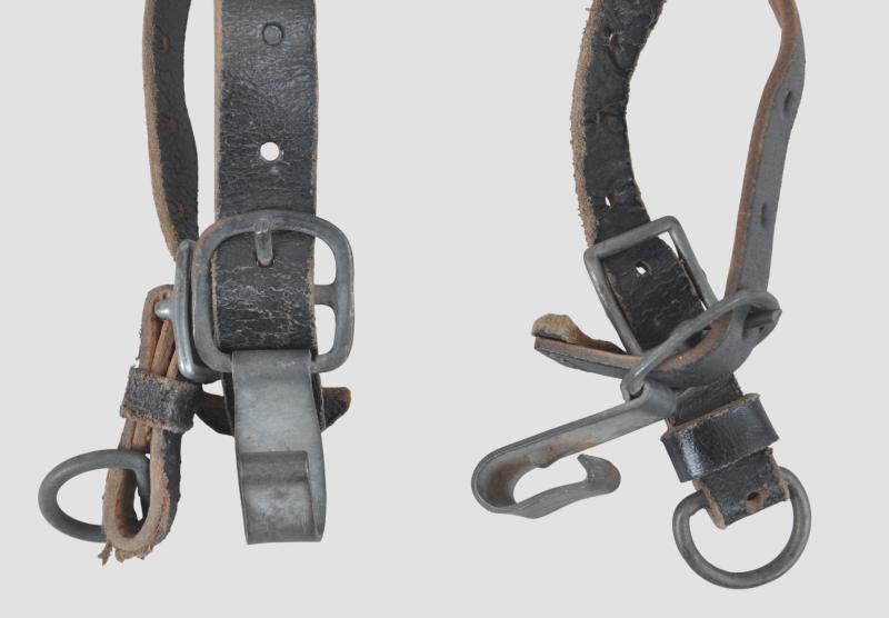 A very good pair of midwar production equipment Y straps with brown & blackened leather contrast , RB numbered to reverse. All grey metal fittings intact with back strap correct.