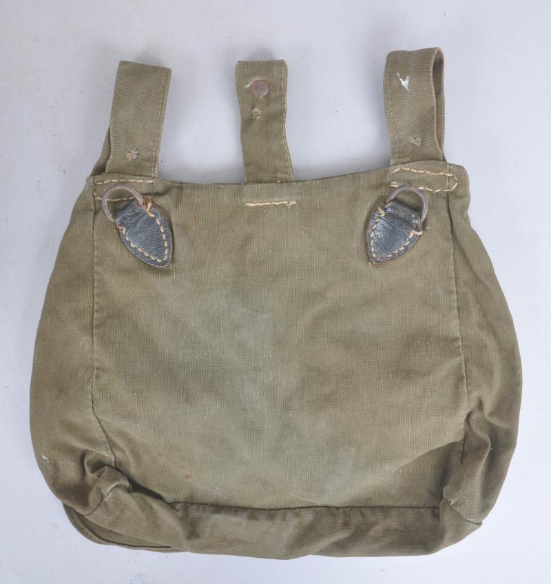 A German army M31 breadbag in olive green canvas with steel & black leather fittings named to underside of flap 'Unteroffizer Frenz' ( Sergeant Frenz ) .